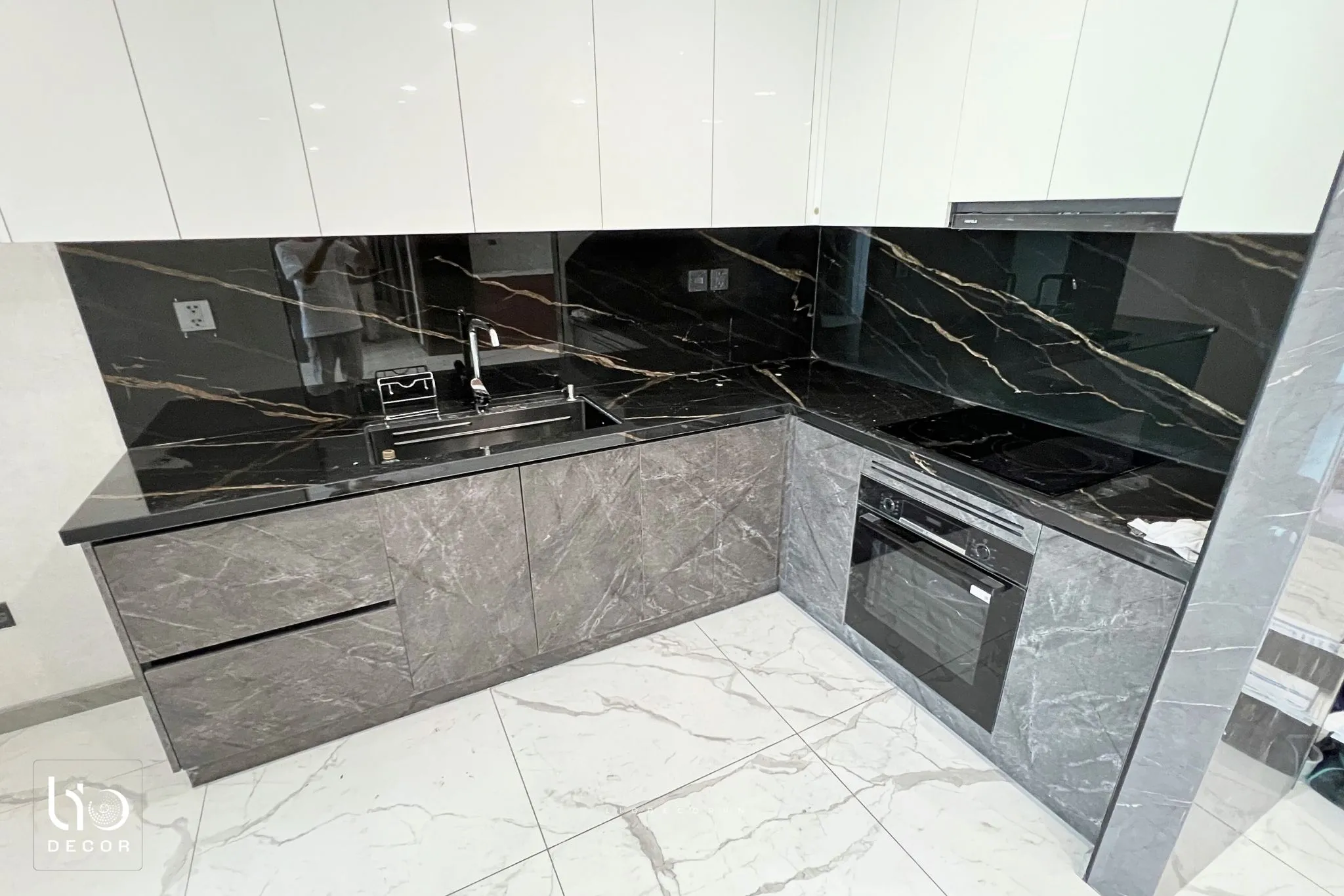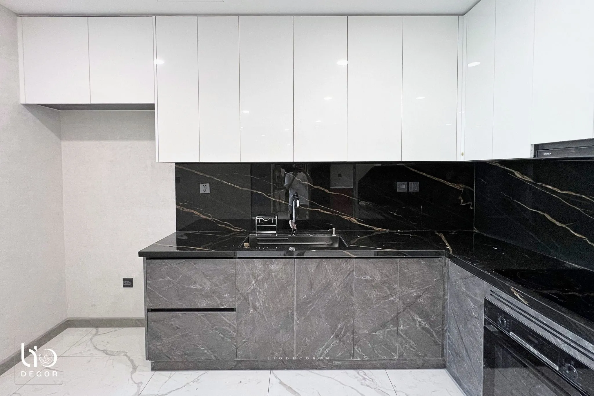 Lio Decor thiết kế hệ tủ bếp kịch trần tối ưu sức chứa. Khu vực bếp được tính toán để người nội trợ thuận tiện thao tác. Mặt đá Vicostone chống thấm ố được ưu tiên sử dụng.